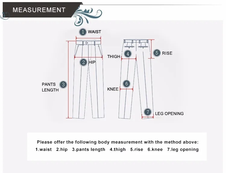 1.Please offer the size of your pants,or the standard size will be sent out.